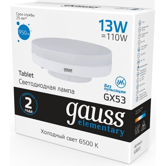 Лампочка светодиодная Gauss Elementary 13В эквивалент 110В 6500K 950Лм GX53 таблетка 83833 (комплект из 2 шт.)