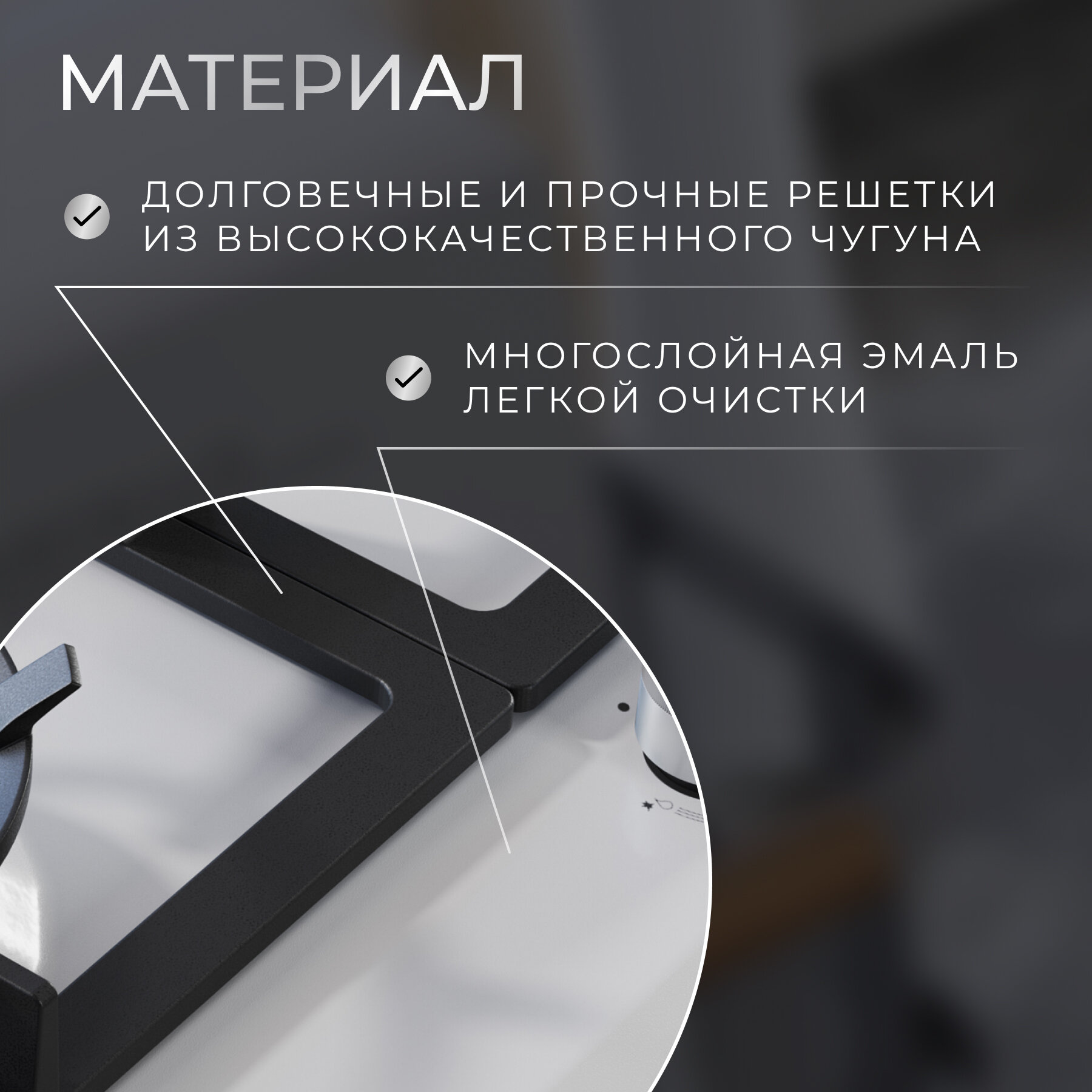 Газовая встраиваемая варочная панель 60 см KURO KHG 641 WH, газ-контроль, электроподжиг, WOK-конфорка, чугунные решетки, белая