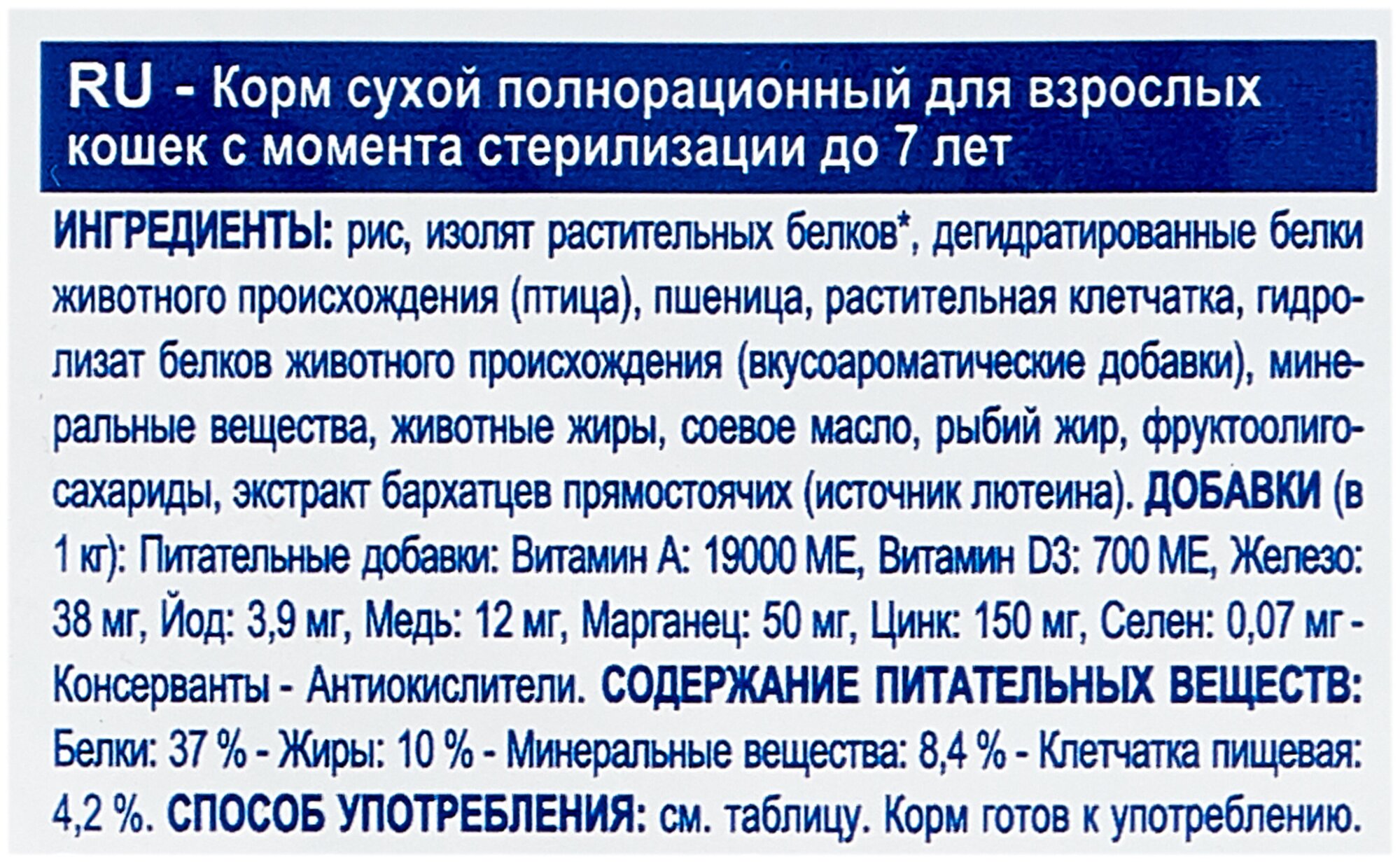 | Состав | рис, изолят растительных белков*, дегидратированные белки животного происхождения (птица), пшеница, растительная клетчатка, гидролизат белков животного происхождения (вкусоароматические добавки), минеральные вещества, животные жиры, соевое масло, рыбий жир, фруктоолигосахариды, экстракт бархатцев прямостоячих (источник лютеина); *L.I.P.: специально отобранные белки с высокой степенью усвояемости |