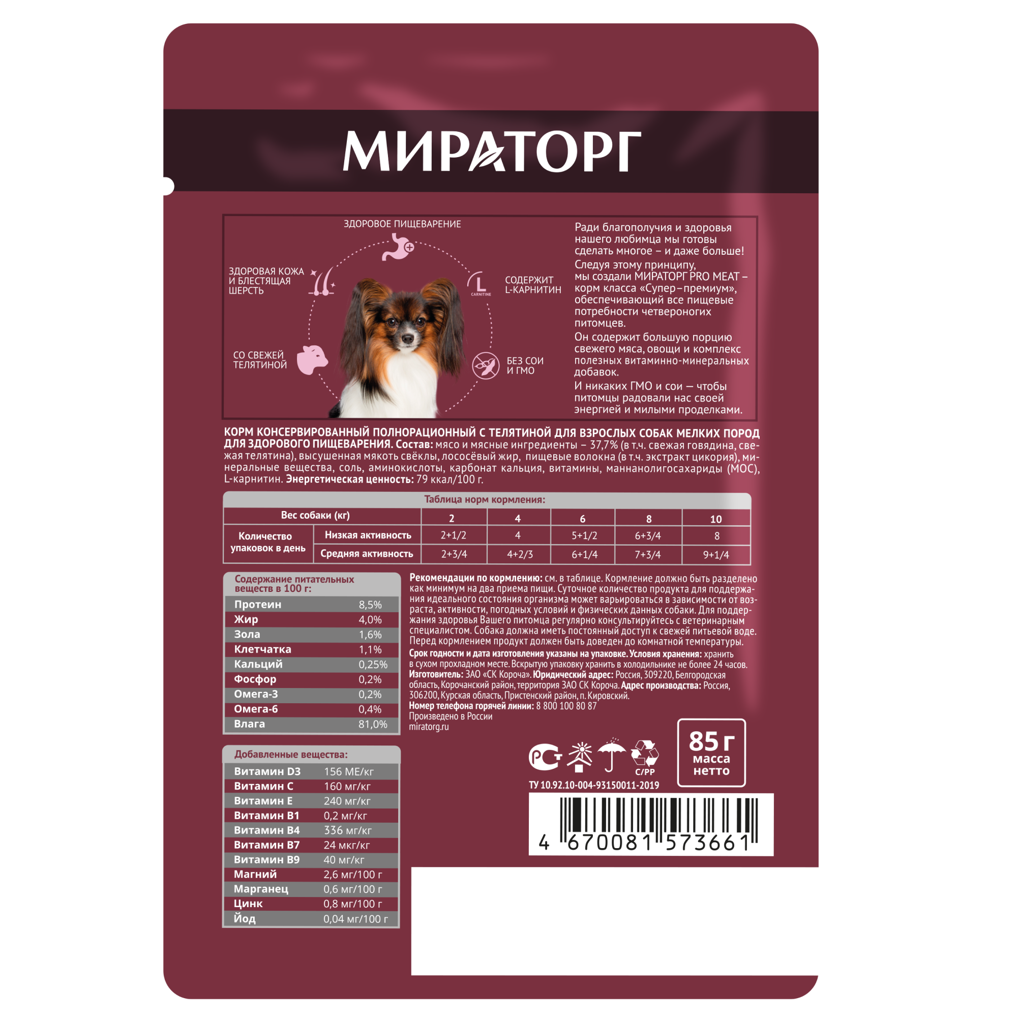 Влажный корм для взрослых собак мелких пород Мираторг с телятиной для здорового пищеварения 24 пауча по 85 г (2,04кг) интересное: