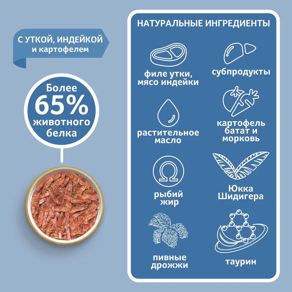 | Состав | филе утки, мясо индейки, субпродукты индейки, бульон из утки, картофель батат, морковь, масло растительное, желирующая добавка, рыбий жир, пивные дрожжи, морские водоросли, экстракт Юкка Шидигера |