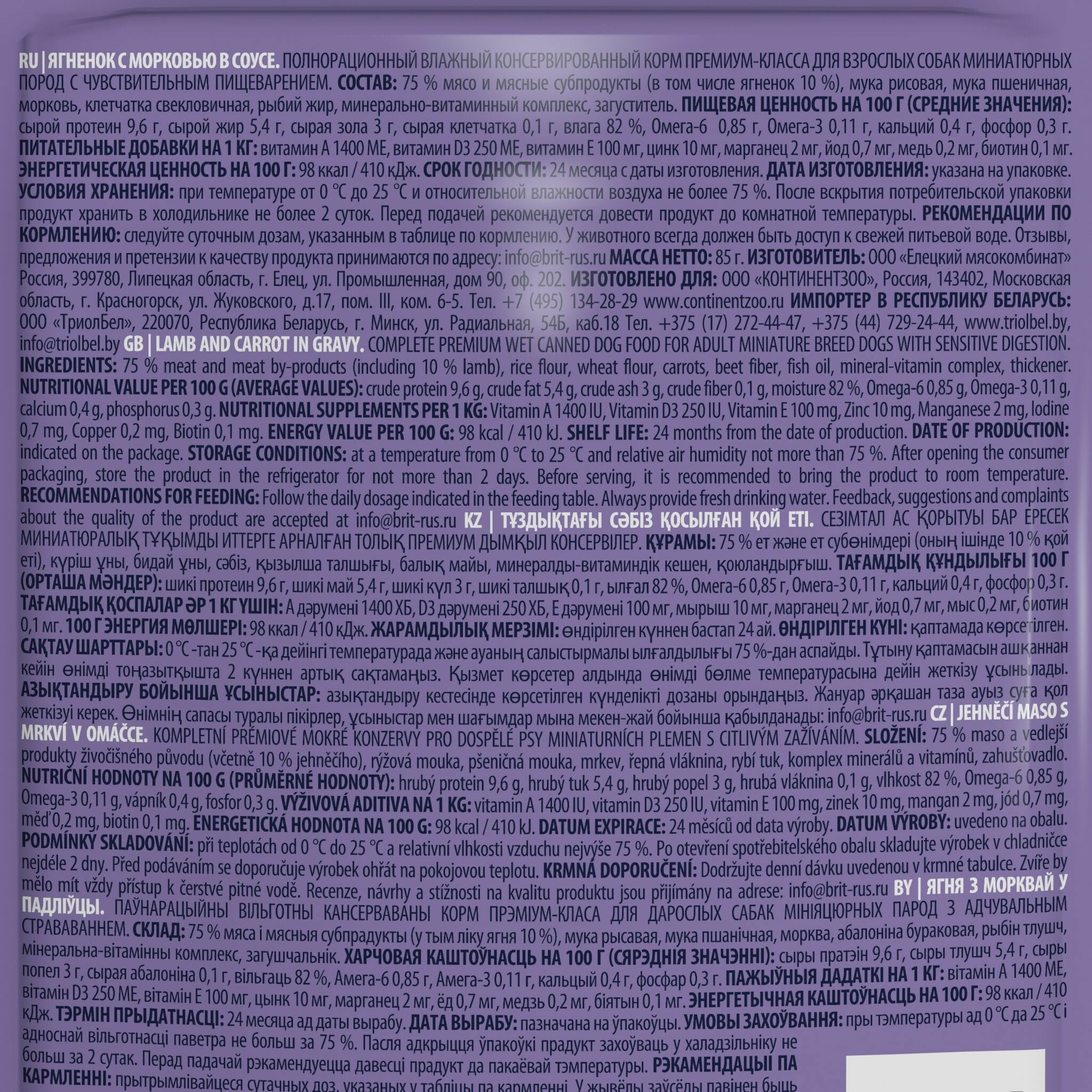 | Состав | 75% мясо и мясные субпродукты (в том числе ягненок 10%), мука рисовая, мука пшеничная, морковь, клетчатка свекловичная, рыбий жир, минерально-витаминный комплекс, загуститель |