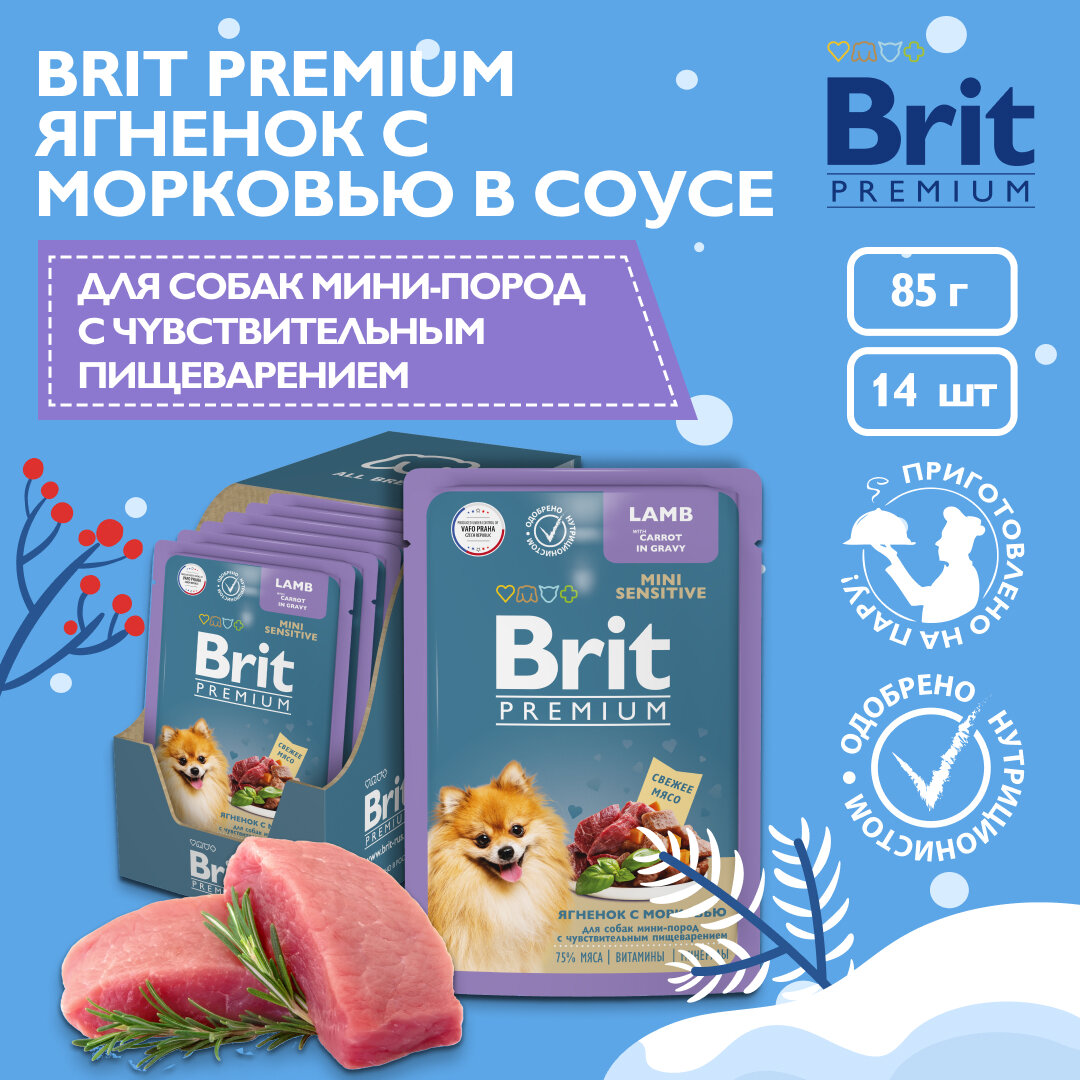 Влажный корм для собак Brit Premium для взрослых мини собак с чувствительным пищеварением, ягненок с морковью в соусе, пауч 1 уп. х 14 шт. х 85 г (для мелких пород)