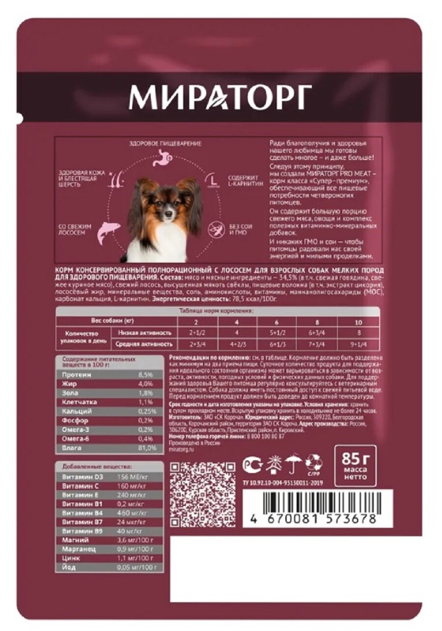 Влажный корм Мираторг Pro Meat для собак мелких пород с чувствительным пищеварением с лососем 24шт х 85 г интересное: