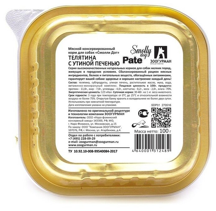 Зоогурман SMOLLY DOG PATE для взрослых собак маленьких пород паштет с телятиной и утиной печенью (100 гр х 15 шт)