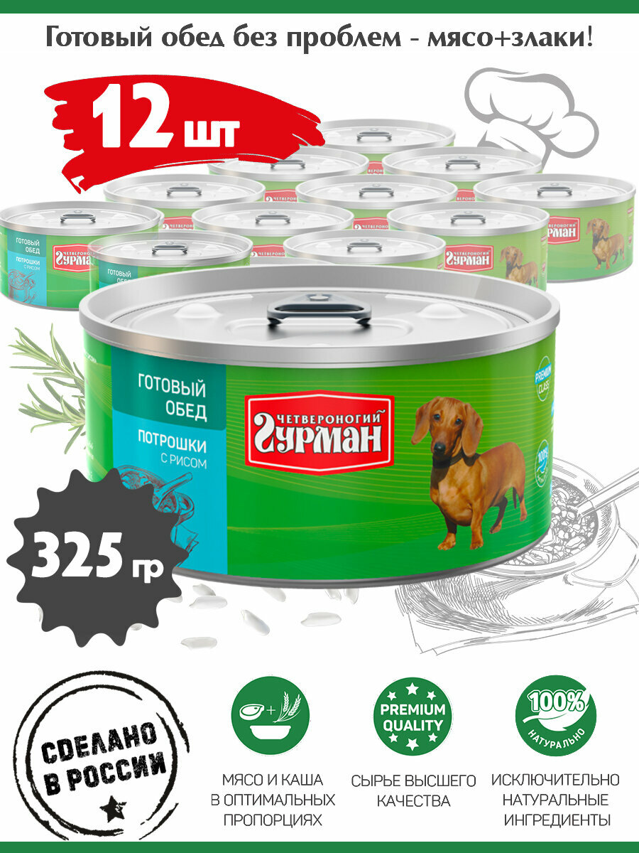 Четвероногий Гурман Готовый Обед для cобак Потрошки с Рисом 12х325г
