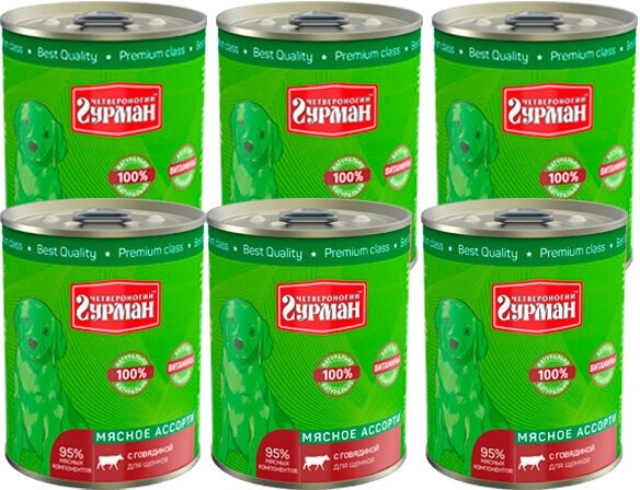 Купить Четвероногий гурман Влажный корм для щенков Мясное ассорти с говядиной 340 г x 6 шт