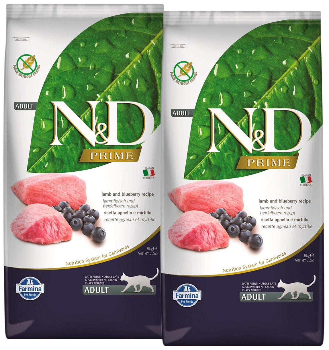 Купить FARMINA CAT N&D PRIME LAMB & BLUEBERRY беззерновой для взрослых кошек с ягненком и черникой (5 + 5 кг)