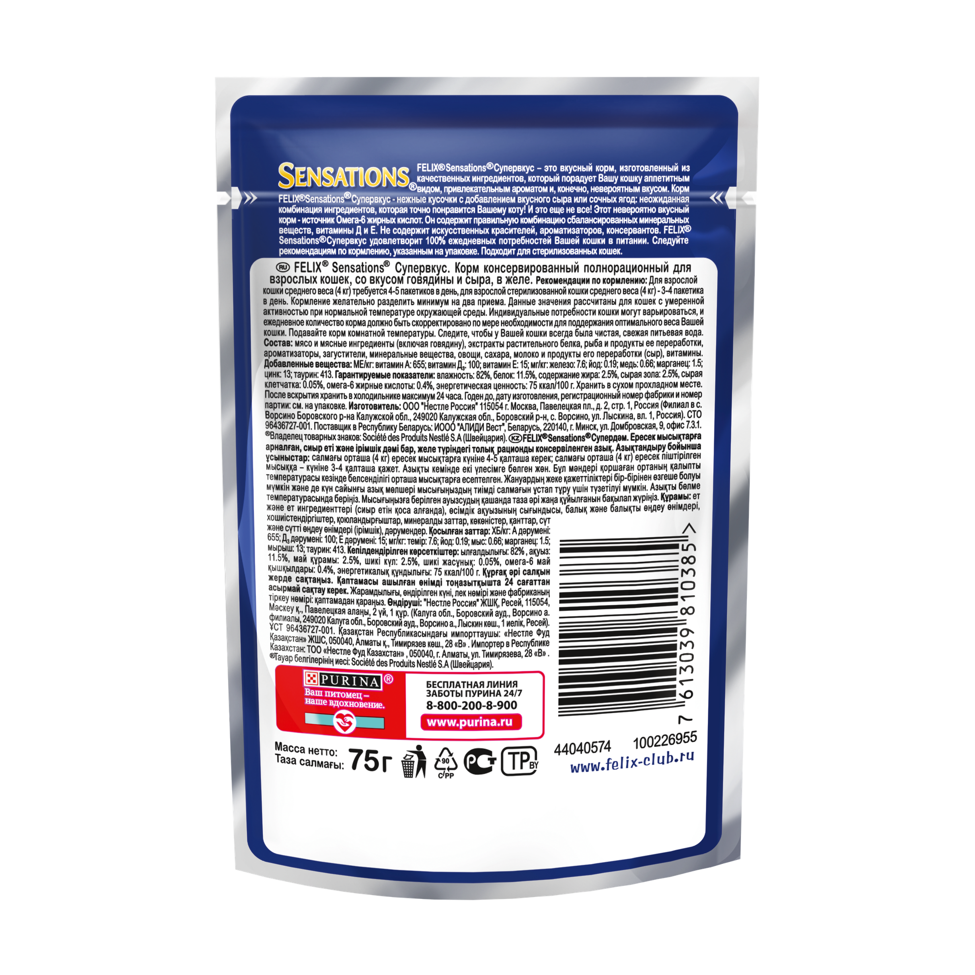 Felix Паучи Sensations кусочки в желе для кошек Супер Вкус Говядина и Сыр 1244896812493544 | Sensations® 0,075 кг 44233 (2 шт)
