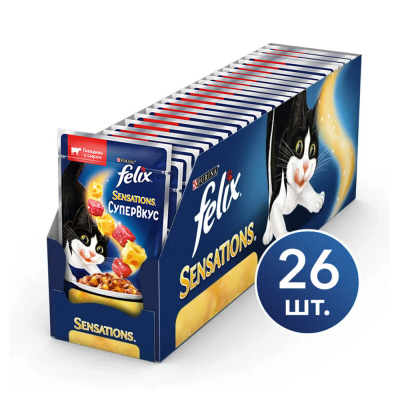 FELIX SENSATIONS супервкус для взрослых кошек с говядиной и сыром в желе (75 гр х 26 шт)
