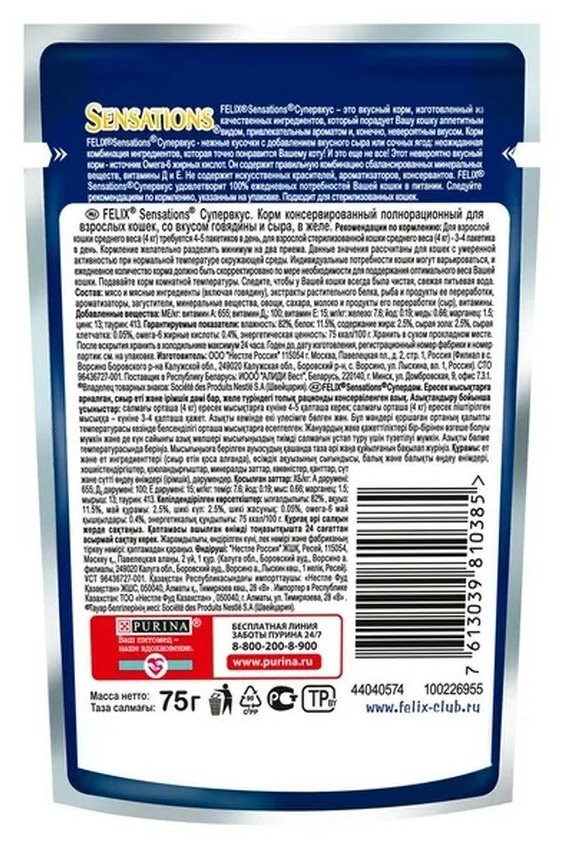 Felix Паучи Sensations кусочки в желе для кошек Супер Вкус Говядина и Сыр 1244896812493544 | Sensations® 0,075 кг 44233 (2 шт)