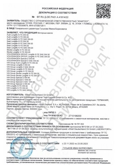 | Допуски OEM | VW 504.00 / VW 507.00 |