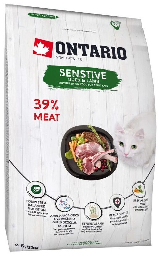 Ontario Для кошек с чувствительным пищеварением с уткой и ягненком (Ontario Cat Sensitive/Derma) 213-10627, 6,500 кг