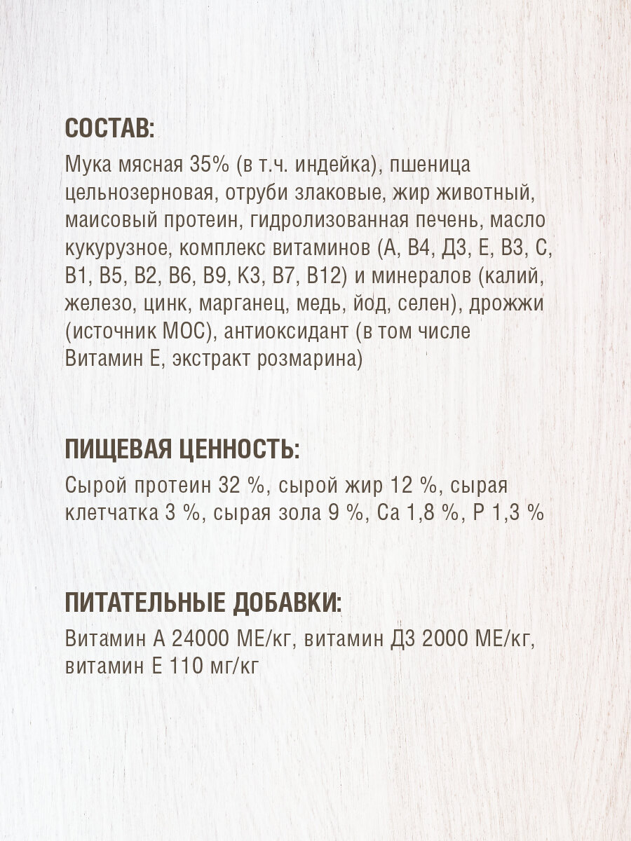 | Состав | Состав: мука мясная 35% (в т.ч. индейка), пшеница цельнозерновая, отруби злаковые, жир животный, маисовый протеин, гидролизованная печень, масло кукурузное, комплекс витаминов (А, В4, Д3, Е, В3, С, В1, В5, В2, В6, В9, К3, В7, В12) и минералов (калий, железо, цинк, марганец, медь, йод, селен), дрожжи (источник МОС), антиоксидант (в том числе Витамин Е, экстракт розмарина). |