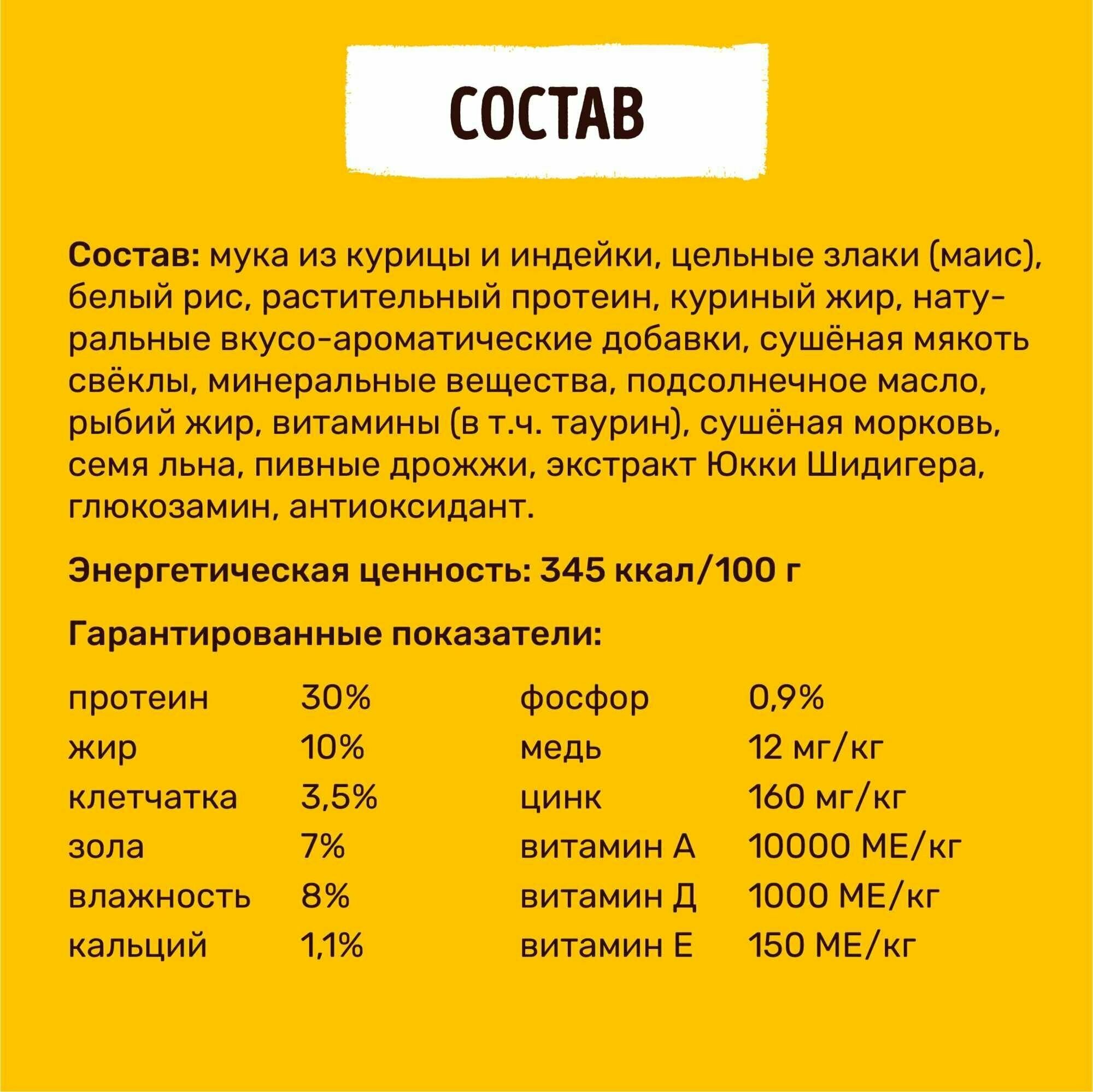 | Состав | мука из курицы и индейки, цельные злаки (маис), белый рис, растительный протеин, куриный жир, натуральные вкусо-ароматические добавки, сушёная мякоть свёклы, минеральные вещества, подсолнечное масло, рыбий жир, витамины (в т.ч. таурин), сушёная морковь, семя льна, пивные дрожжи, экстракт юкки Шидигера, глюкозамин, антиоксидант |