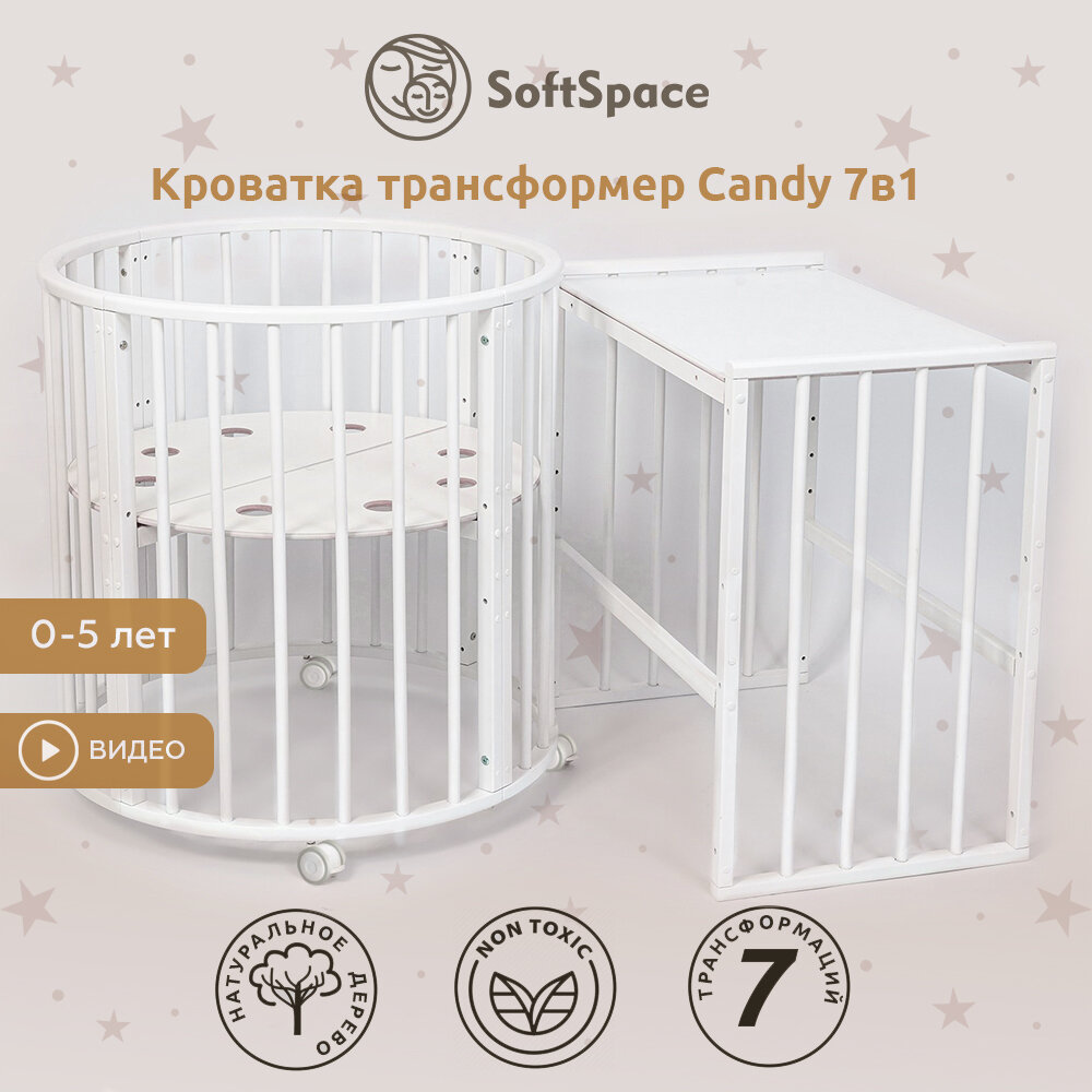 Детская кроватка трансформер SoftSpace Candy 7в1, 125x75 см, 75x75 см, Береза, цвет Белый интересное: