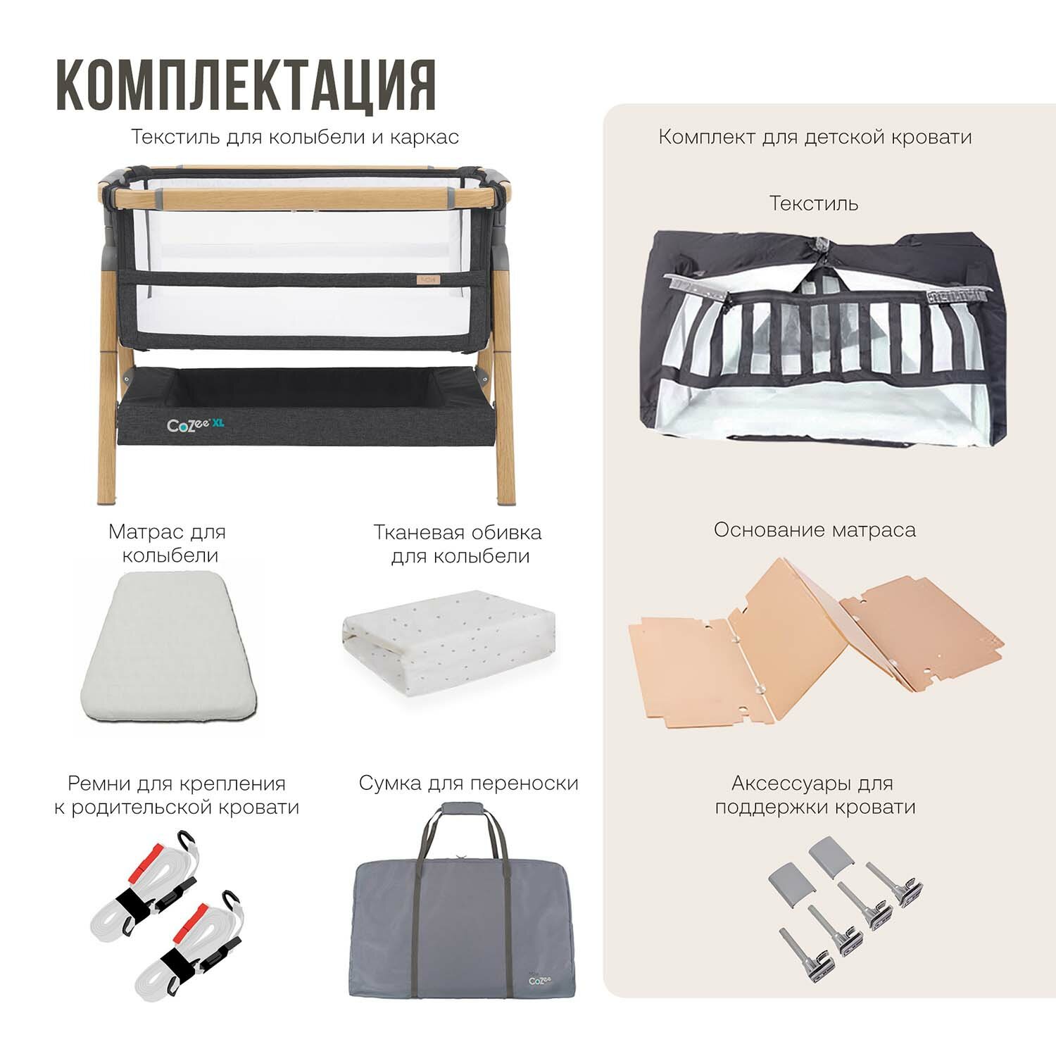 | Комплектация | Расширяемая колыбель/каркас детской кровати 1 комплект Тканевая обивка для колыбели и кровати 1 комплект Матрас для колыбели 1 шт Ремни для крепления к родительской кровати 1 комплект Сумка для переноски кровати-трансформера 1 шт Основание матраса для кровати 1 шт Аксессуары для поддержки кровати 1 комплект |