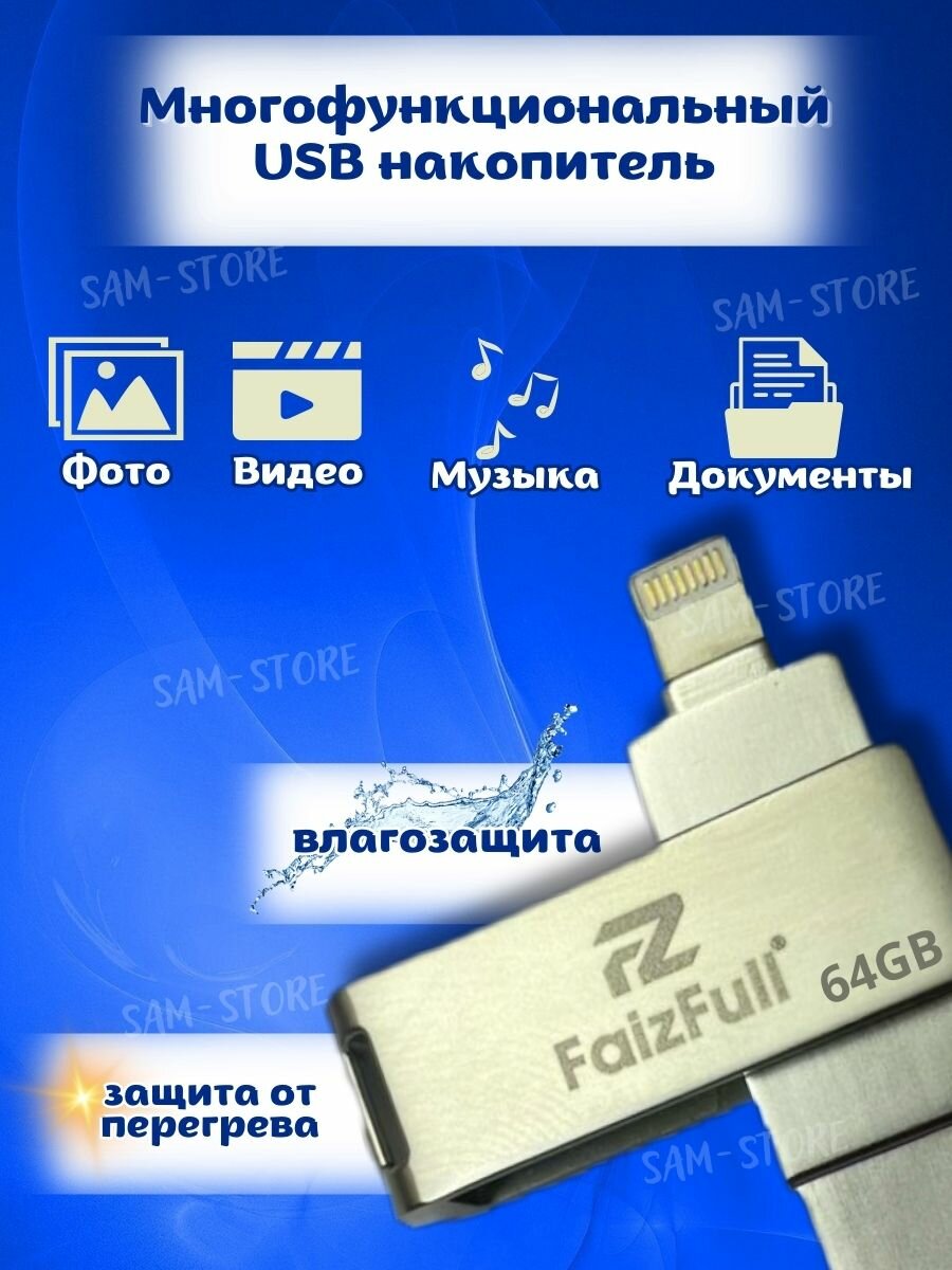 Флеш-накопитель для айфона Lider mobile USB 3.0 Flash Drive , 64 ГБ, 3-в-1 , Водонепроницаемый чип , Cеребристый
