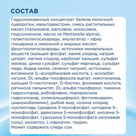 | Состав | гидролизованный концентрат белков молочной сыворотки, мальтодекстрин, смесь растительных масел (пальмовое, рапсовое, кокосовое, подсолнечное, масло из Mortierella alpina), галактоолигосахариды, эмульгатор – эфир глицерина и лимонной и жирных кислот, фруктоолигосахариды, источники минеральных веществ (кальция фосфат, калия хлорид, натрия цитрат, магния хлорид, карбонат кальция, сульфат железа, цинка сульфат, сульфат марганца, сульфат меди, йодид калия, селенит натрия), источники витаминов (L-аскорбиновая кислота, L-аскорбат натрия, DL-альфа-токоферола ацетат, никотинамид, кальция D-пантотенат, D-биотин, фолиевая кислота, ретинола пальмитат, DL-альфа-токоферол, тиамина гидрохлорид, рибофлавин, пиридоксина гидрохлорид, холекальциферол, фитоменадион, цианокобаламин), рыбий жир, холина хлорид, нуклеотиды (уридина 5-монофосфат, цитидина 5-монофосфат, аденозина 5-монофосфат, инозина 5-монофосфат, гуанозина 5-монофосфата натриевая соль), инозитол, L-карнитин, таурин. Может содержать следы сои |