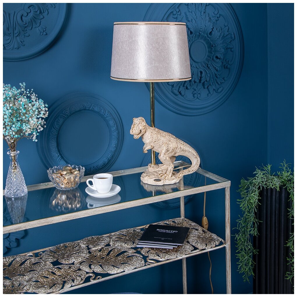 Купить Настольная лампа Bogacho Динозавр Тирекс кремовая с бежевым абажуром под кожу Игуаны