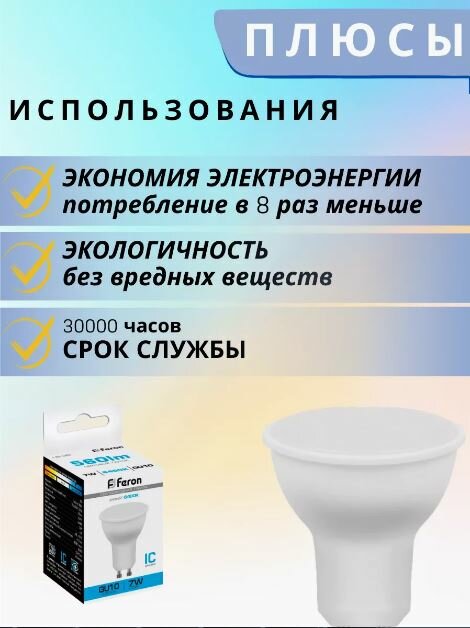 10шт/уп. Лампа LED Спот 7Вт 230B PAR16 GU10 560Лм 6400К Свет Холодный белый арт. 25291 Feron, уп. 10шт