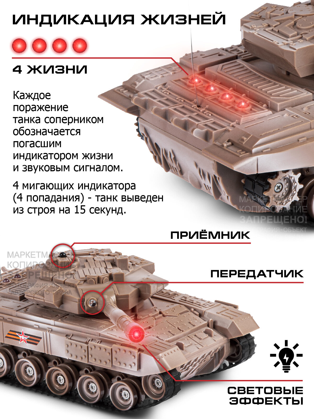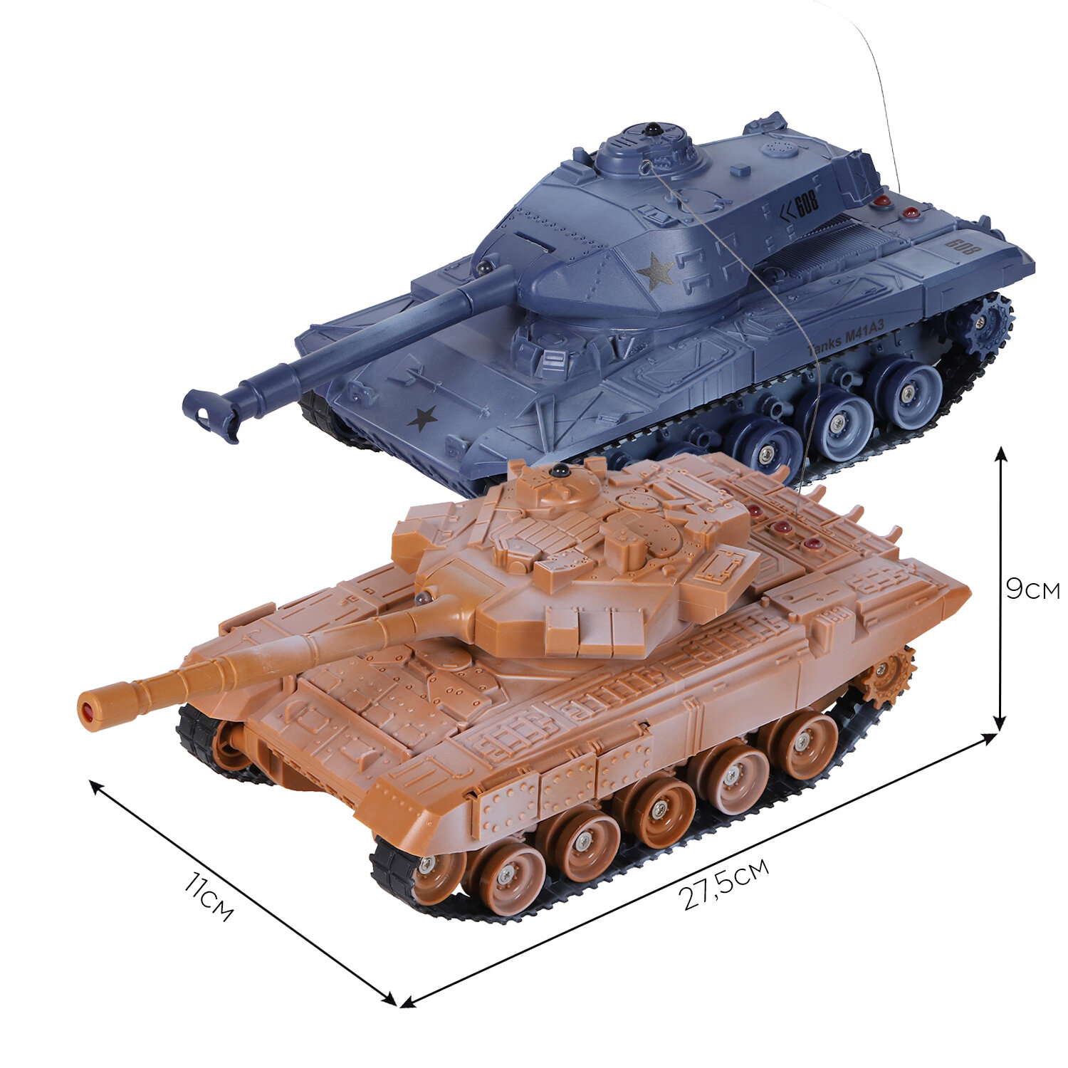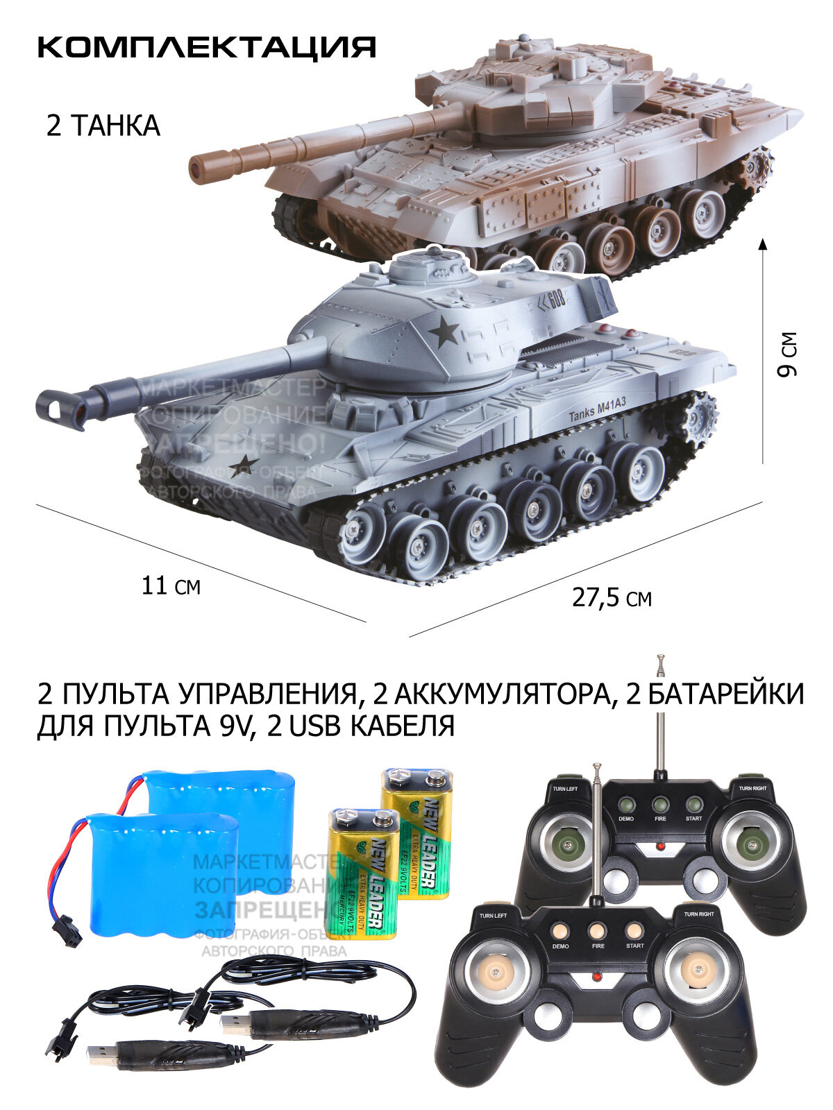 | Комплектация | 2 танка, 2 пульта, 2 аккумулятора 4.8V, 2 зарядных устройства, 2 батарейки 9V |