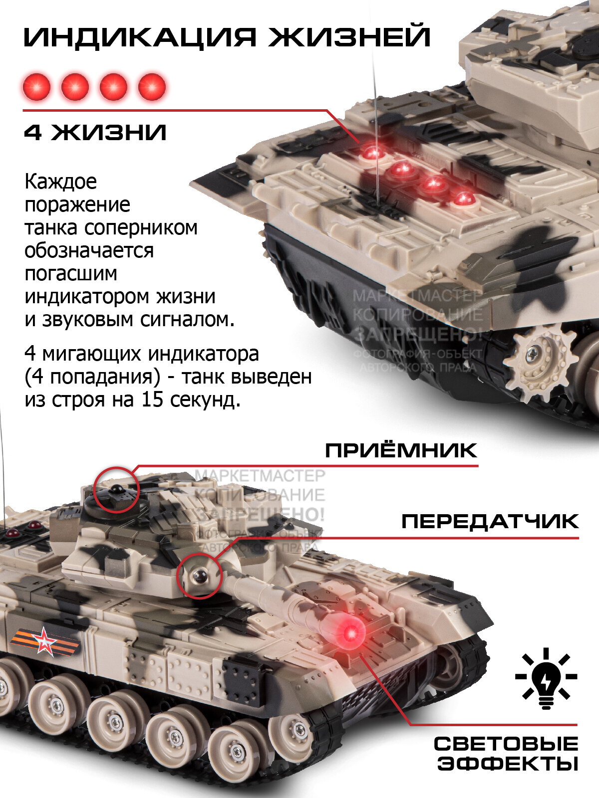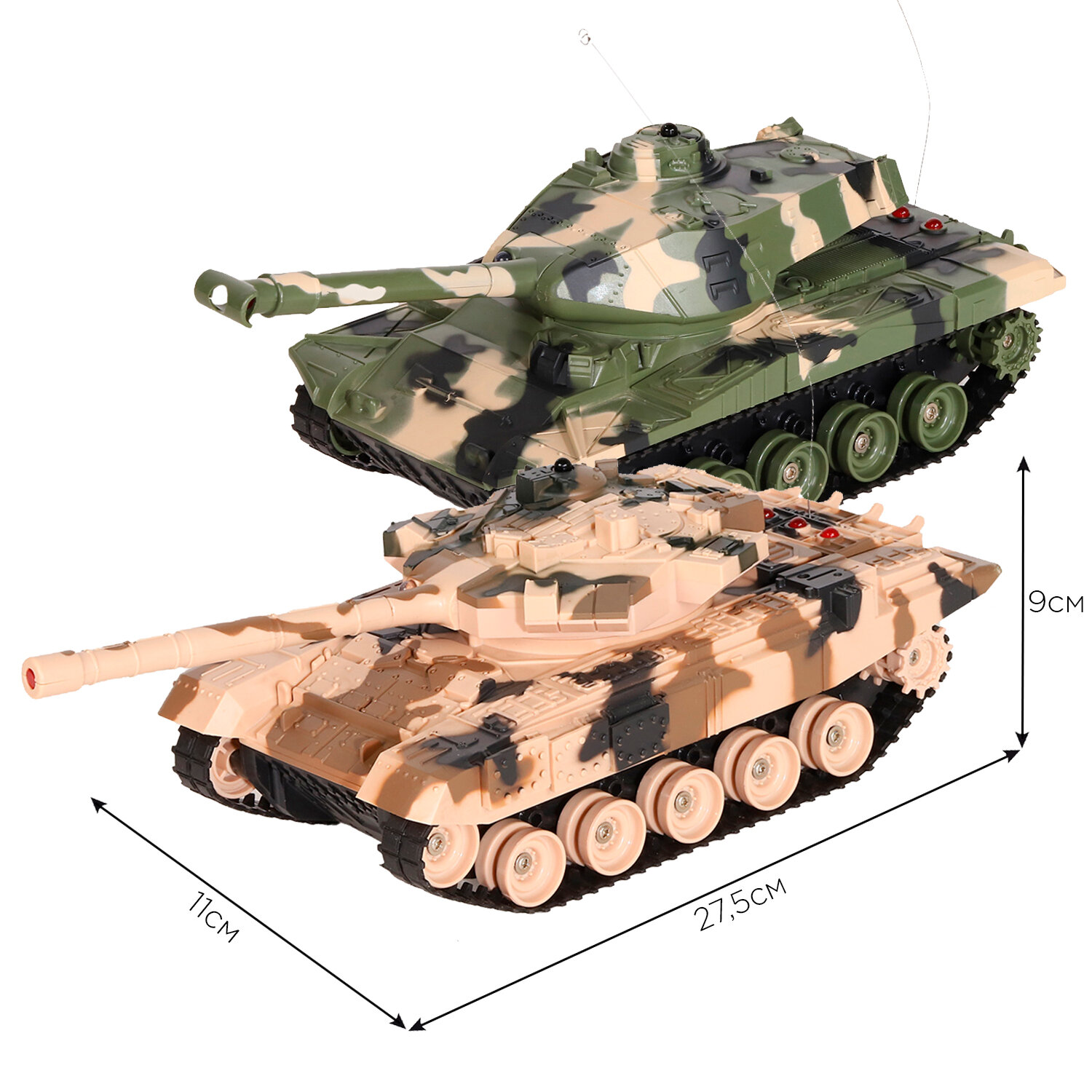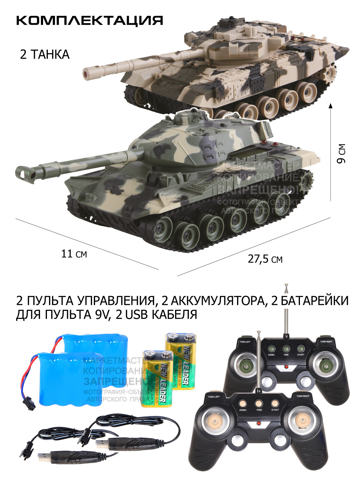 | Комплектация | 2 танка, 2 пульта, 2 аккумулятора 4.8V, 2 зарядных устройства, 2 батарейки 9V |