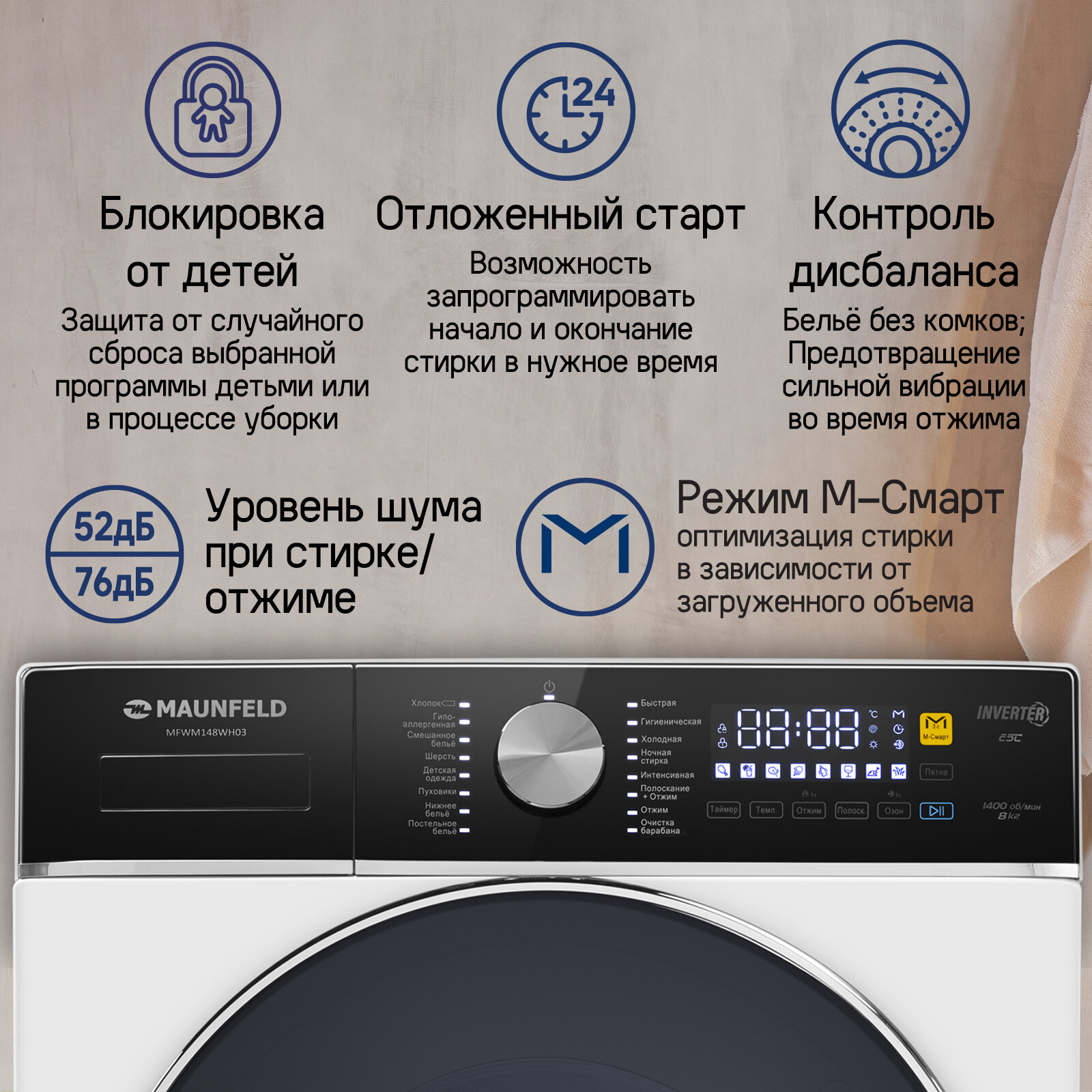 Стиральная машина с инвертором MAUNFELD MFWM148WH03, 8 кг, 1400 об/мин, М-старт, LED дисплей, подсветка барабана