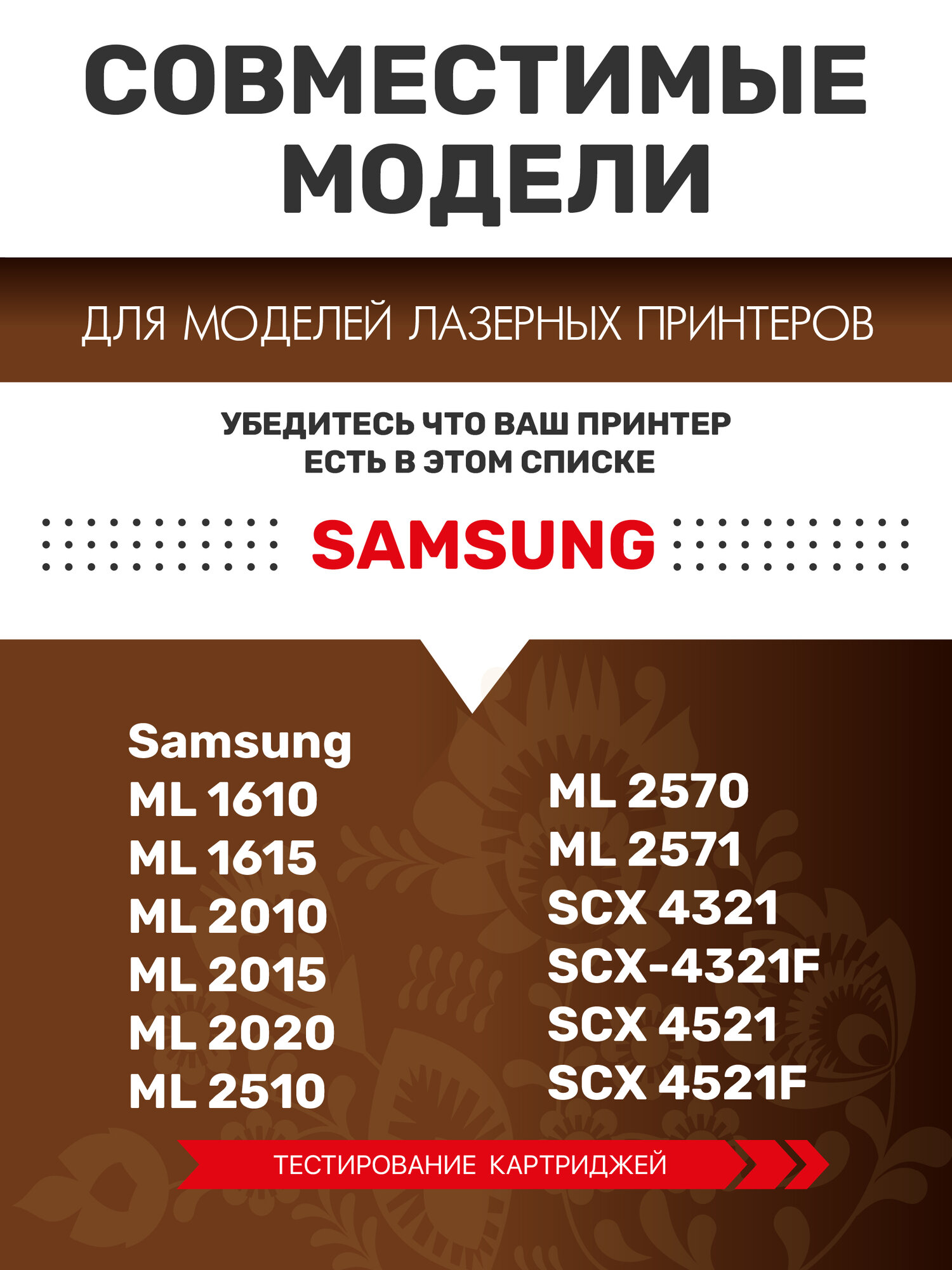 | Модель совместимого принтера | DELL 1100 / DELL 1110 / Samsung ML-1610 / Samsung ML-1615 / Samsung ML-1620 / Samsung ML-1625 / Samsung ML-2010 / Samsung ML-2015 / Samsung ML-2020 / Samsung ML-2510 / Samsung ML-2570 / Samsung ML-2571 / Samsung ML-2571N / Samsung SCX-4321 / Samsung SCX-4521 / Samsung SCX-4521F / Xerox Phaser 3117 / Xerox Phaser 3122 / Xerox Phaser 3124 / Xerox Phaser 3125 / Xerox Phaser 3125N |