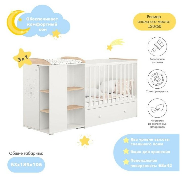 Кроватка-трансформер детская Polini kids French 800, Teddy, с комодом, белый-дуб пастельный 5505663 интересное: