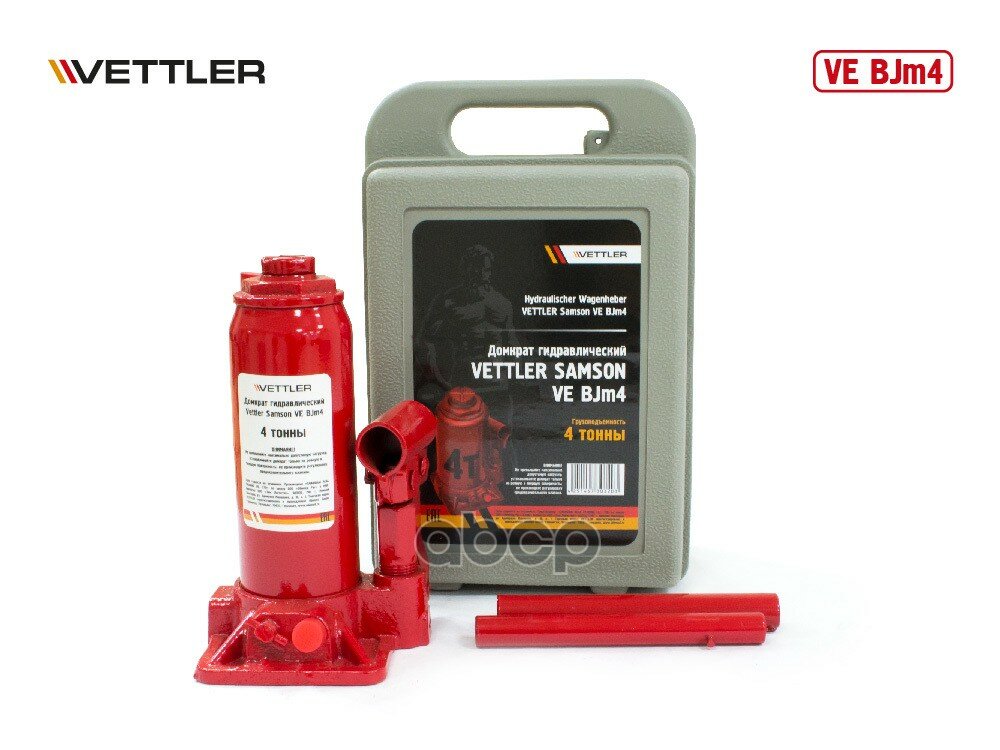 Ниже Вы можете прочитать отзывы на Домкрат автомобильный бутылочный VETTLER VE BJm4 158x308 в кейсе Samson 4 т, ознакомится с подробными характеристиками, посмотреть интересные обзоры и фотографии на Домкрат автомобильный бутылочный VETTLER VE BJm4 158x308 в кейсе Samson 4 т.