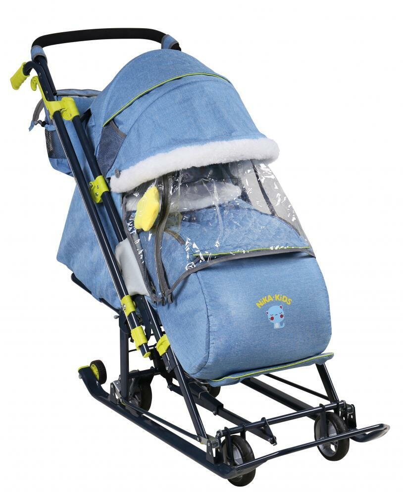 Санки-коляска Ника детям-7-7 синий в джинсовом стиле с механизмом качания интересное: