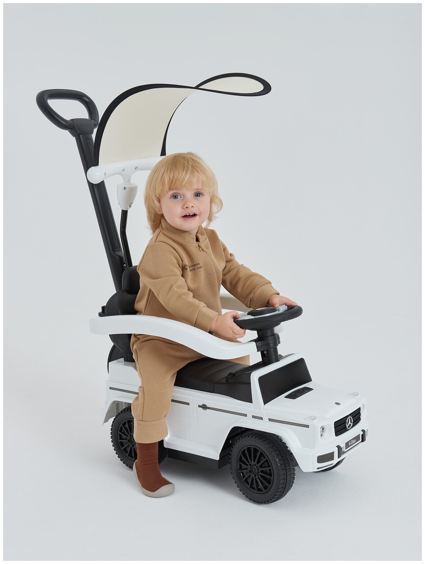 50010, Машина-каталка Happy Baby Mercedes Benz G350d с рулём, с родительской ручкой, звуковые эффекты, с козырьком от солнца, белый интересное: