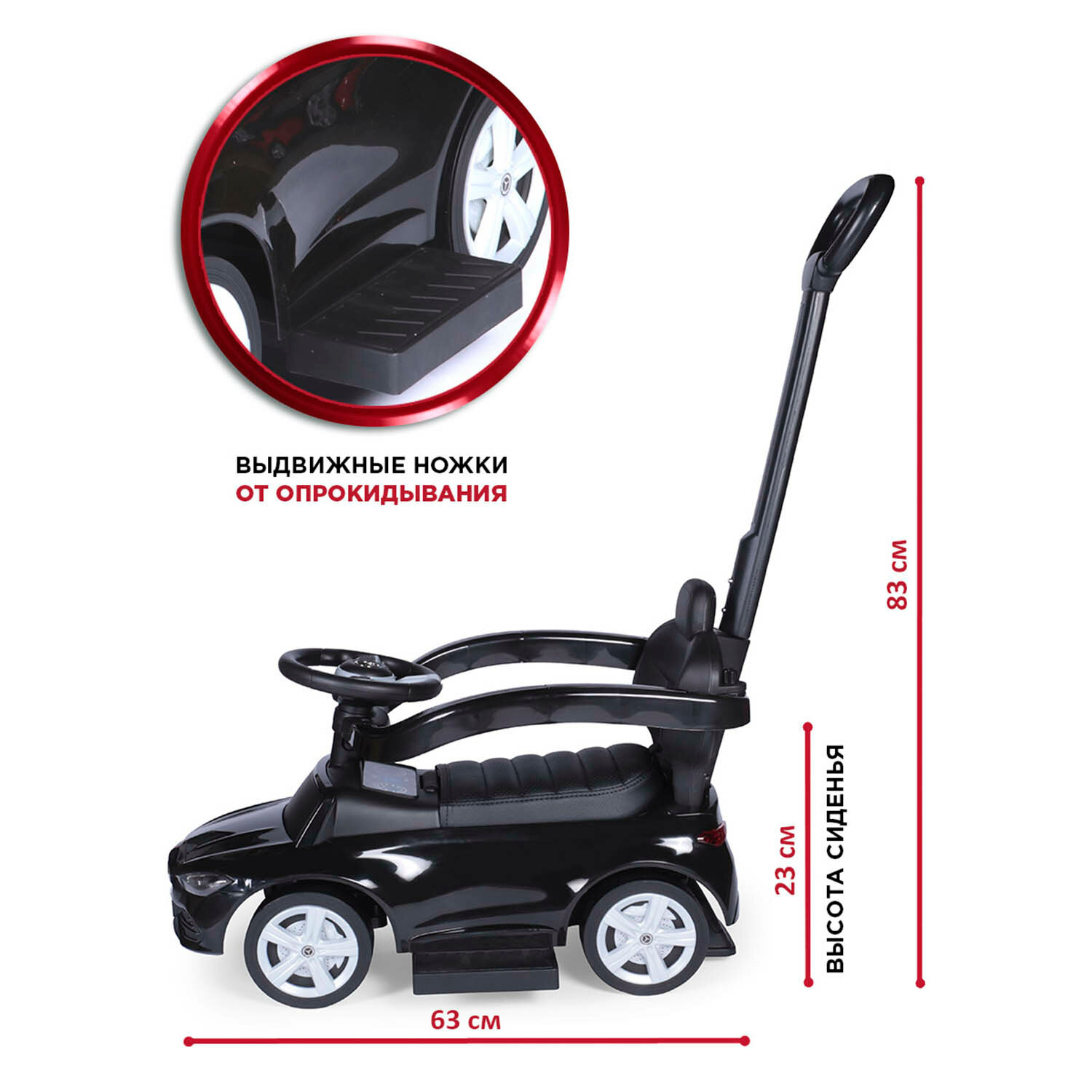 | Дополнительная информация | высота сиденья от уровня пола: 23 см; диаметр резиновых: колёс 13 см |