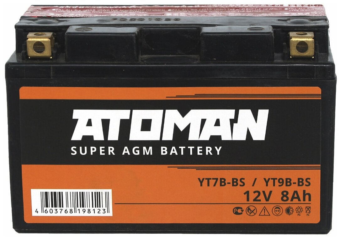 Автомобильный аккумулятор аккумулятор Мото ATOMAN Super AGM 12V 8Aч (YT7B-BS) сухозар. п/п электролит в комплекте интересное: