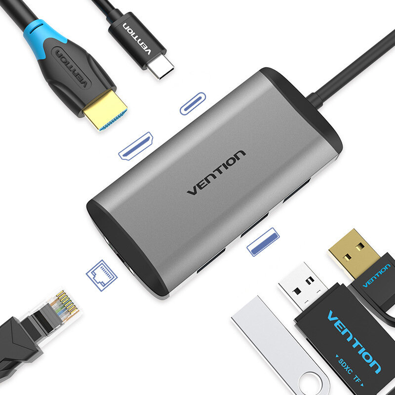 Концентратор USB Type C Vention Cnchb (usb 3.1 M / OTG USB 3.0 F x 2 / Hdmi 19F / RJ45 F / USB Type