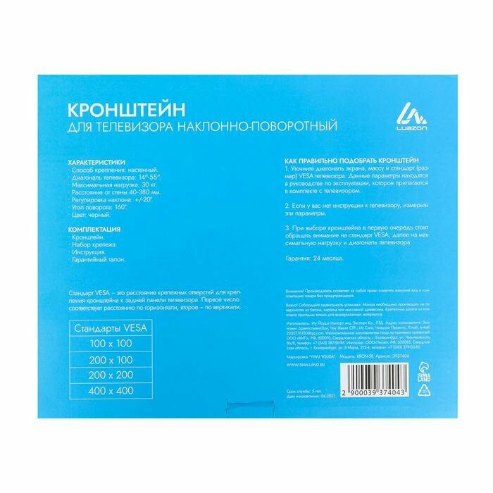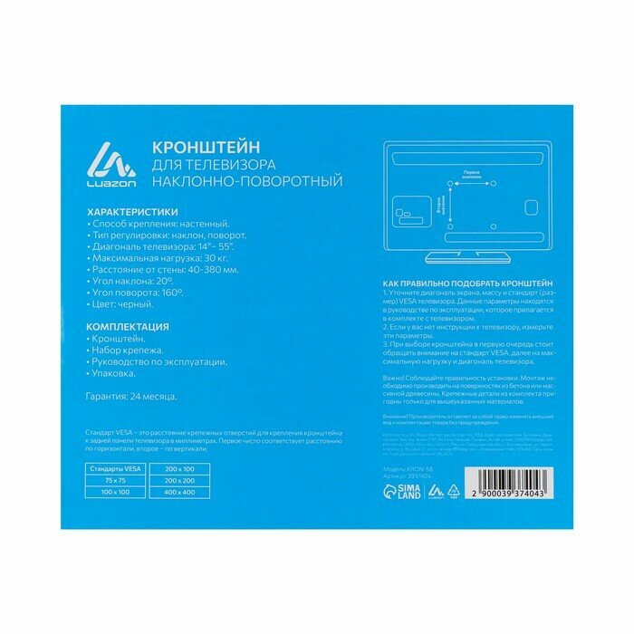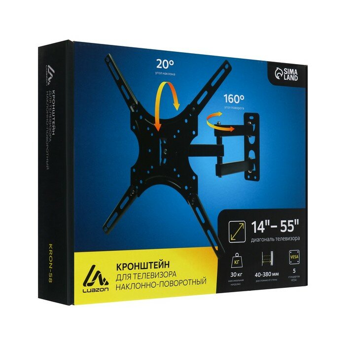 Кронштейн Luazon KrON-58, для ТВ, наклонно-поворотный, 14-55", 40-380 мм от стены, чёрный интересное: