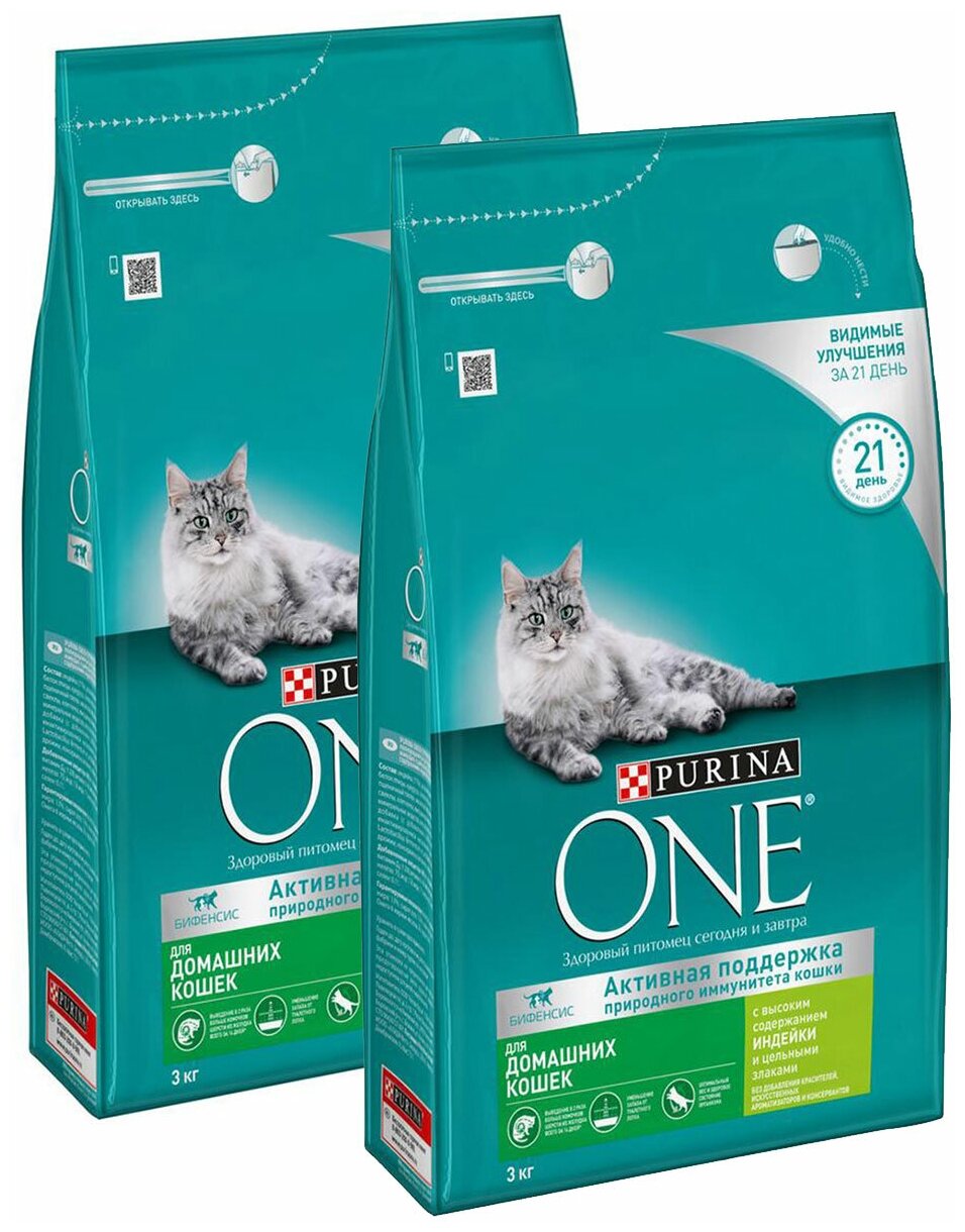 Купить PURINA ONE для взрослых кошек живущих дома с индейкой и злаками (3 + 3 кг)
