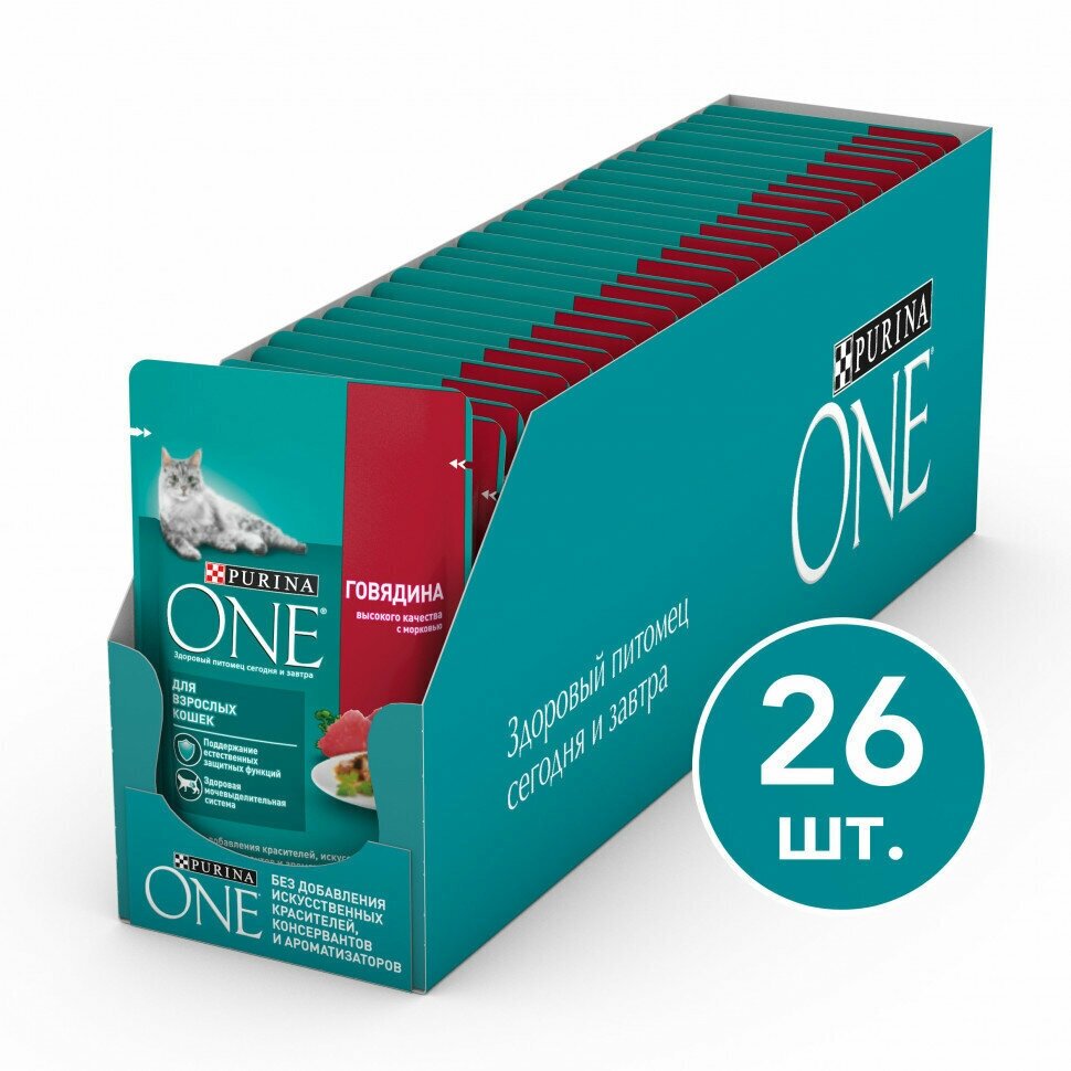 Влажный корм для кошек Purina ONE с говядиной, с морковью 26 шт. х 75 г (кусочки в желе)