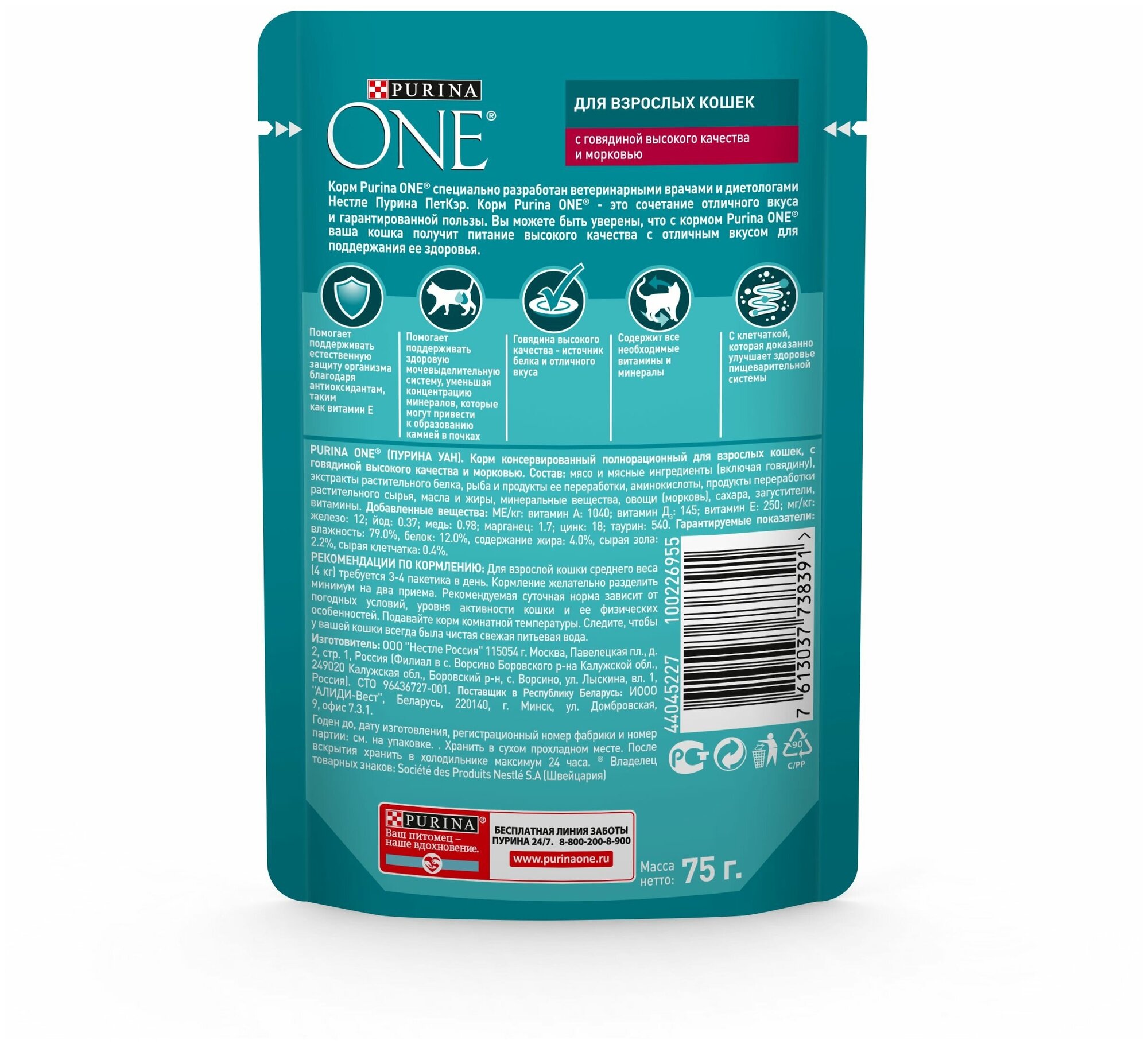 Влажный корм Purinа one для взрослых кошек, говядина/морковь, 75 г