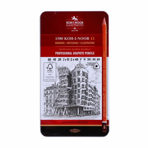 Карандаши чернографитные KOH-I-NOOR 1582 12 шт, 6B-6H, трехгранный, металлический пенал 1582012001PL