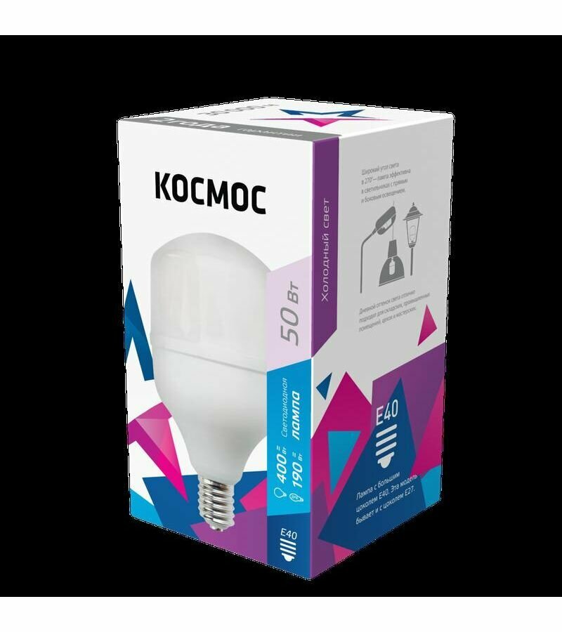 Лампа светодиодная высокомощная Космос 50Вт 6500К e27, переходник с e27 на e40 в комплекте