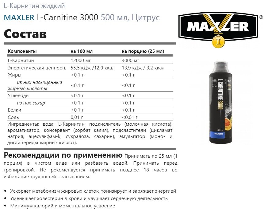 СохранитьКарнитин Maxler L-Carnitine 500 ml 3000 мг. - Цитрус интересное:
