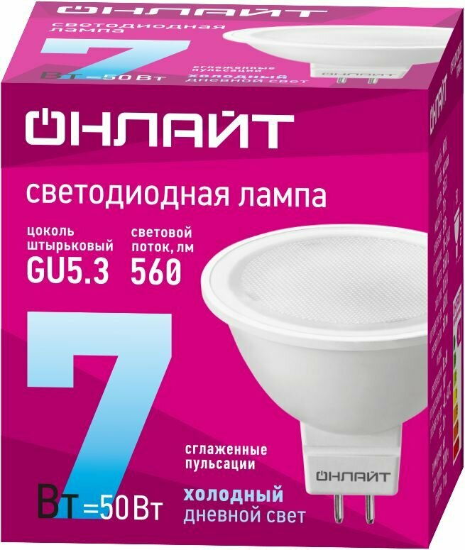 Онлайт MR16 GU5.3 220V 7W(560Lm) 6500K 6K 50x50 матовая OLL-MR16-7-230-6.5K-GU5.3 61134