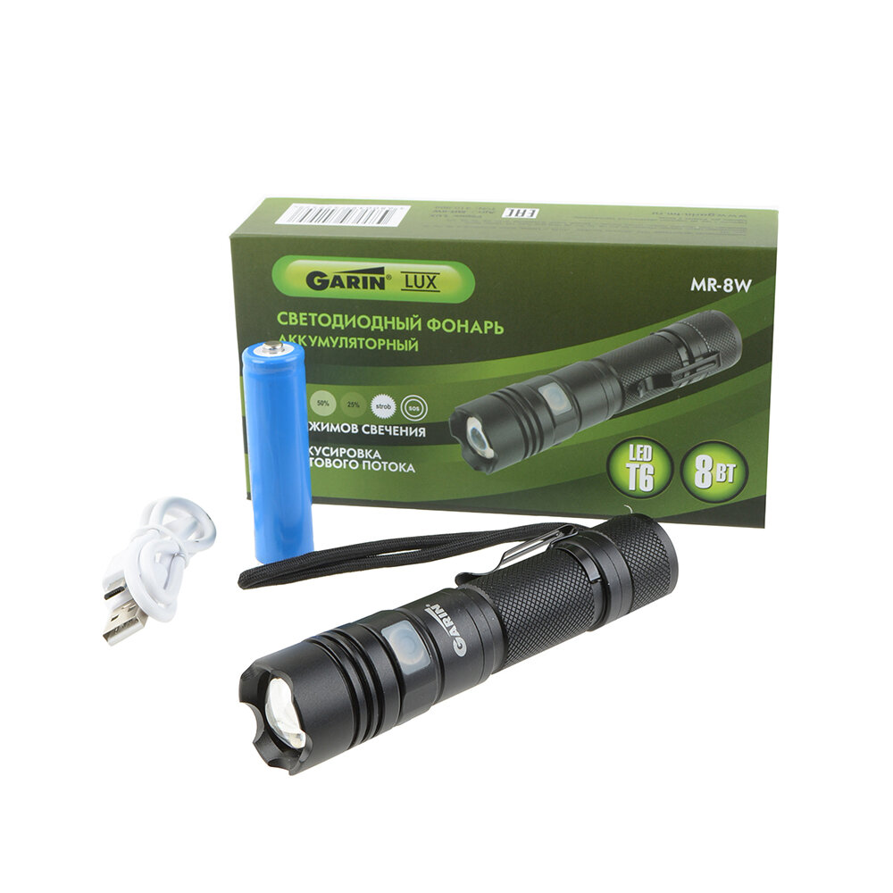Ручной фонарь, светодиодный LED, GARIN MR-8W, светодиод Т6, 18650, 8Вт