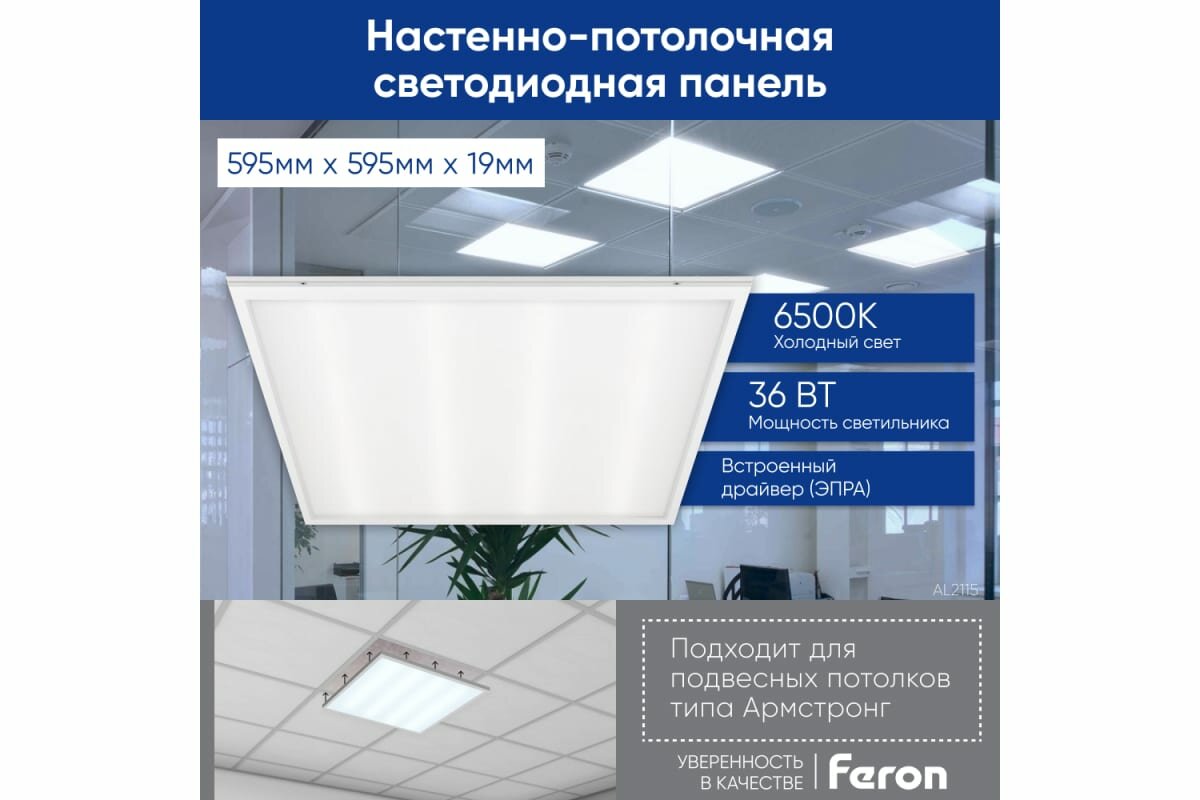 Светильник встраиваемый Армстронг FERON AL2115, 21083, 36W 6500K 2900Lm IP40
