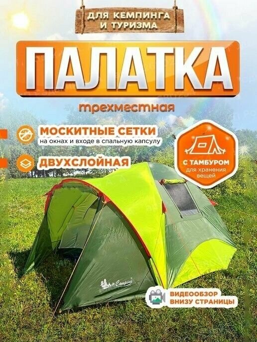 Палатка ART1908, 3-местная, кемпинговая, двухслойная, с тамбуром, зеленая