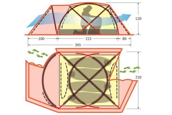 | Особенности | вентиляционные отверстия / ветрозащитная/снегозащитная юбка / внутренняя палатка / огнеупорная пропитка |