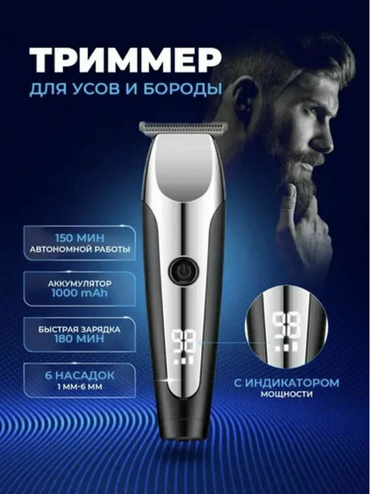 Триммер электрический машинка V-059 для стрижки и бритья бороды усов волос окантовки с насадками дисплеем индикатором заряда барбершоп