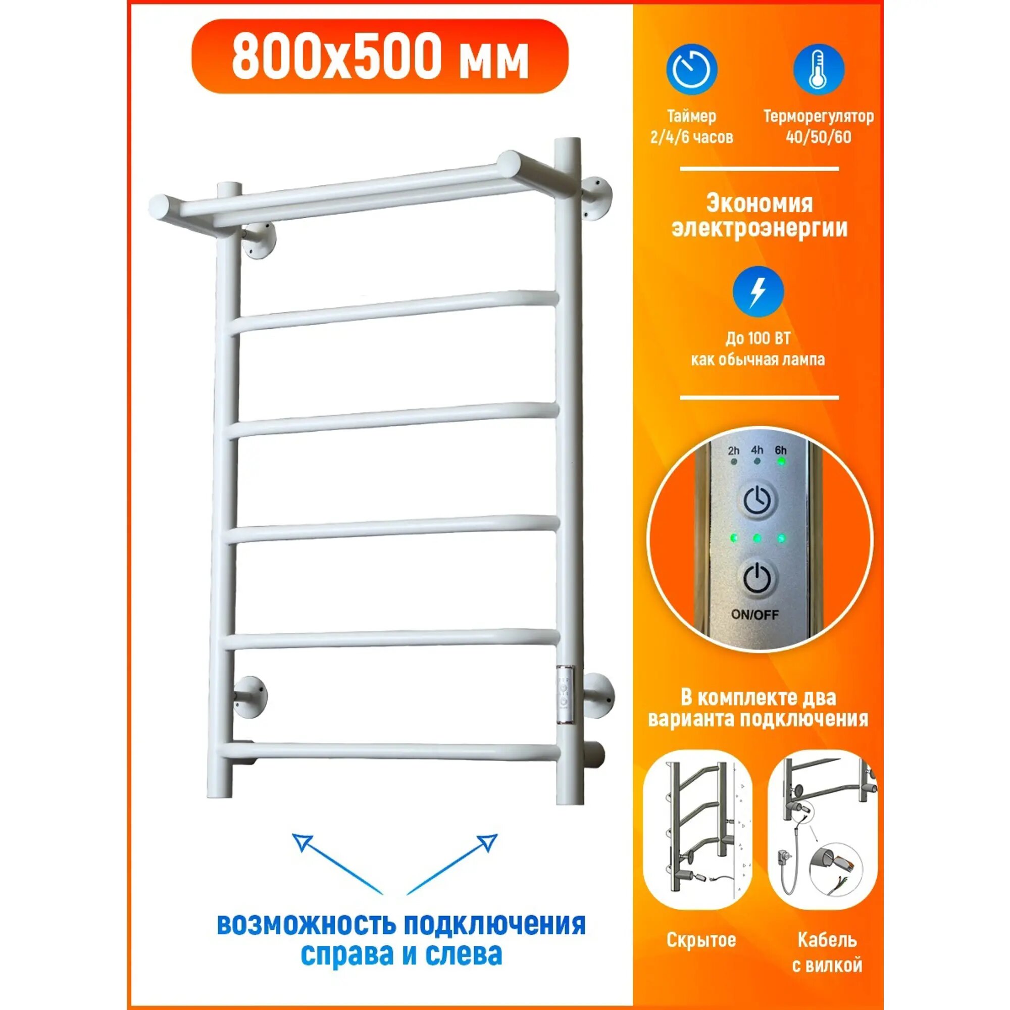 Полотенцесушитель электрический белый ПЭК сп 6 ВГП 80 на 50 с полкой, таймер, скрытое универсальное подключение